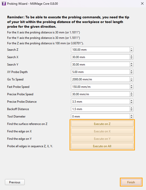 Set Tool Diameter to the diameter of the tool you're using to probe. This allows MillMage to adjust the searching distance offset to account for the size of the tool.