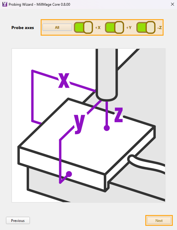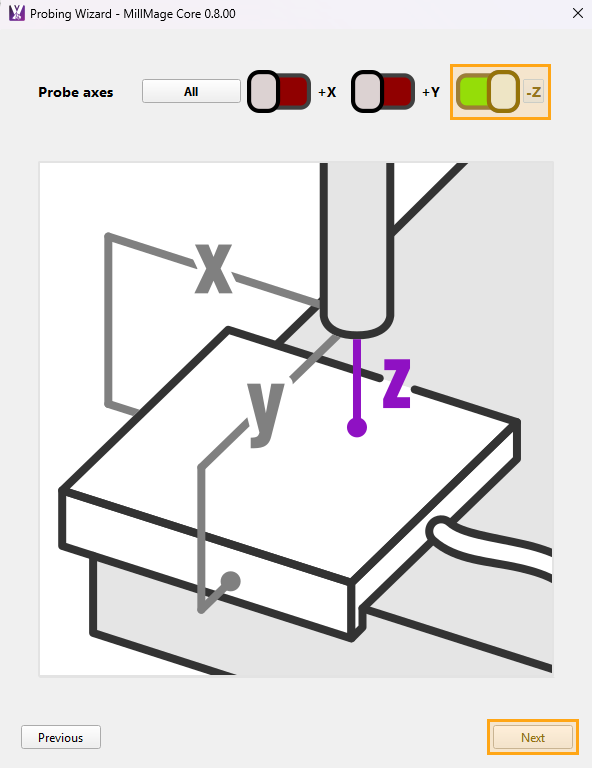 Select the axes you want to probe using your probe block. Turn off X and Y axis probing if using a Z axis only probing puck.