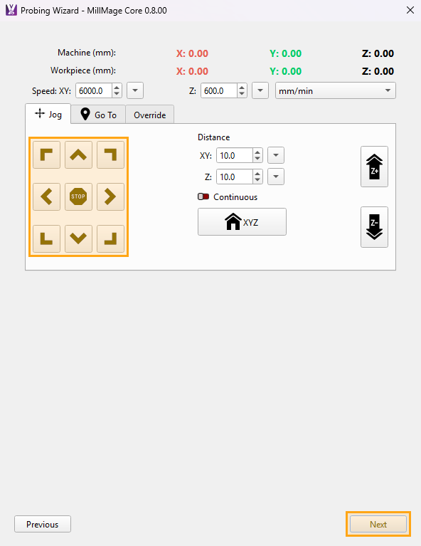 Use the jogging controls to position your tool over the Probe Block, ideally an inch or a centimeter above and near each face of the probe block. The tip of the tool must be within your user-set search distance. View the Move Window page for more information on the jogging controls.