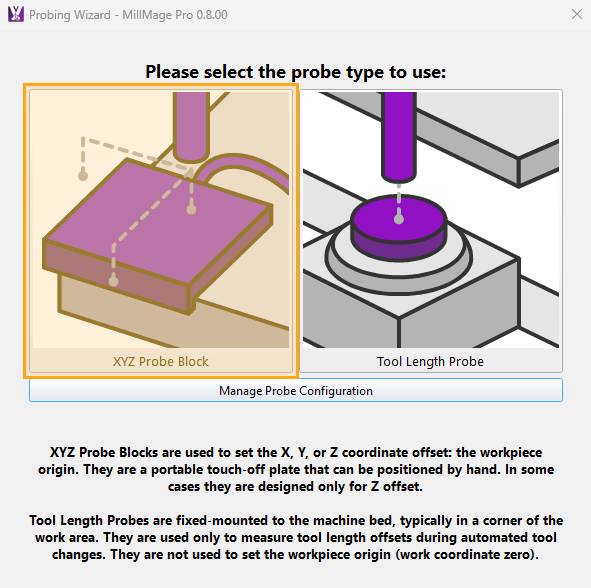 Select XYZ Probe Block to open the settings panel for that accessory. These settings help MillMage understand the shape of your probing block, and how to approach the block for probing.