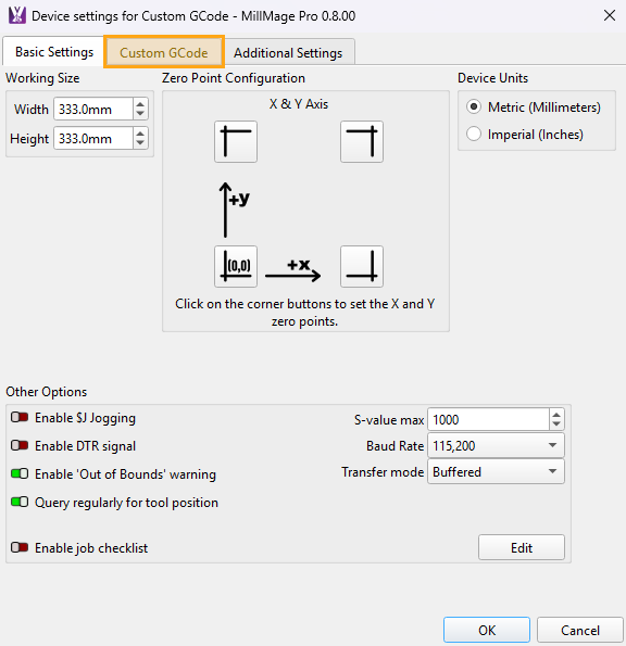 in the Main Toolbar, or by selecting CNC Tools → Device Settings and select the Custom GCode tab at the top of the window. -
