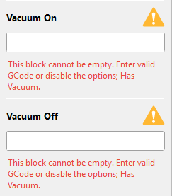 Check that the Vacuum Off Custom GCode field is set to