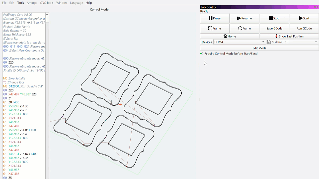 This one's a game-changer, folks. MillMage can connect to, jog, zero, and directly send jobs to machines running GRBL or Smoothieware. Direct control opens up the ability to easily segment out multi-tool or multi-step jobs, just by flipping a few output switches.