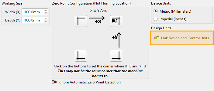 When the Link Design and Control Units toggle is enabled, changing either control units or design units will change both. To control them separately, turn off this setting. With the toggle disabled, the two unit types can be changed independently — useful if you want to design with imperial units of measure but control your machine using metric units, or vice versa.