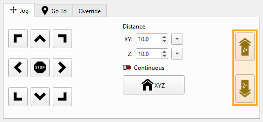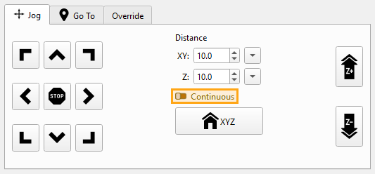 Use the elements in the Jog tab to manually move each axis, in different length increments. Click any option in the image below to jump to more information, or scroll down for a list of options and descriptions.