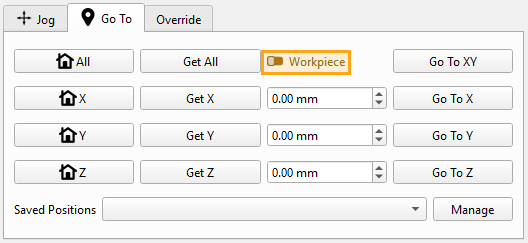 Use the Get All button to get the current X, Y, and Z coordinates. Depending on whether Use Workpiece Coordinates is enabled, this may be in either the Workpiece coordinate space or the Machine coordinate space. Use Get X, Get Y, or Get Z to get the current position in a single axis.