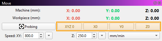 Use the Move Window to jog the tool around the work area, activate optional hardware features, home the axes, get tool position, establish project origins when zeroing out each axis, and move the tool to saved positions.