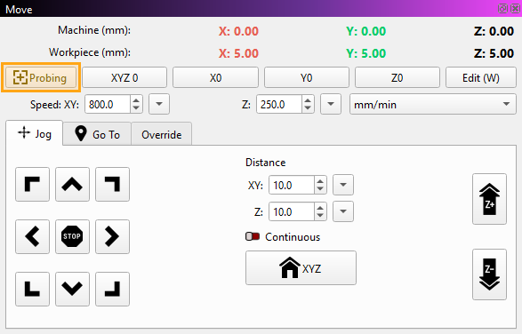 Open the Probing Wizard by selecting CNC Tools → Probing Wizard, or by clicking the Probing button in the Move Window.