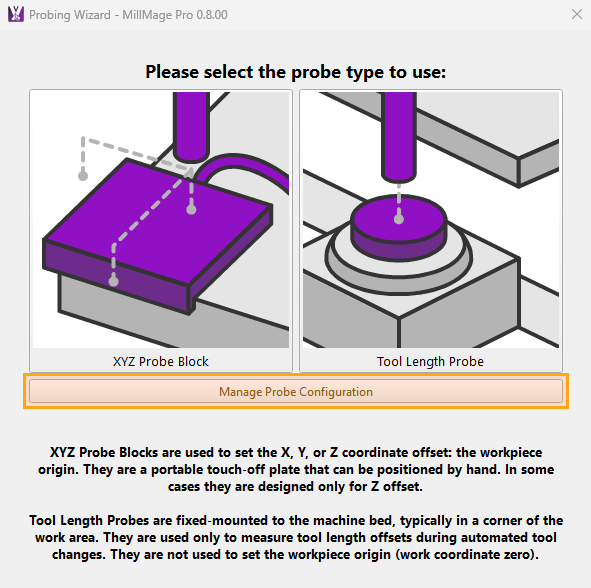 Select XYZ Probe Block to open the settings panel for that accessory. These settings help MillMage understand the shape of your probing block, and how to approach the block for probing.