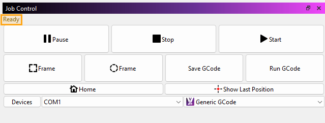 Your CNC machine is selected and reads ready in the Job Control Window,