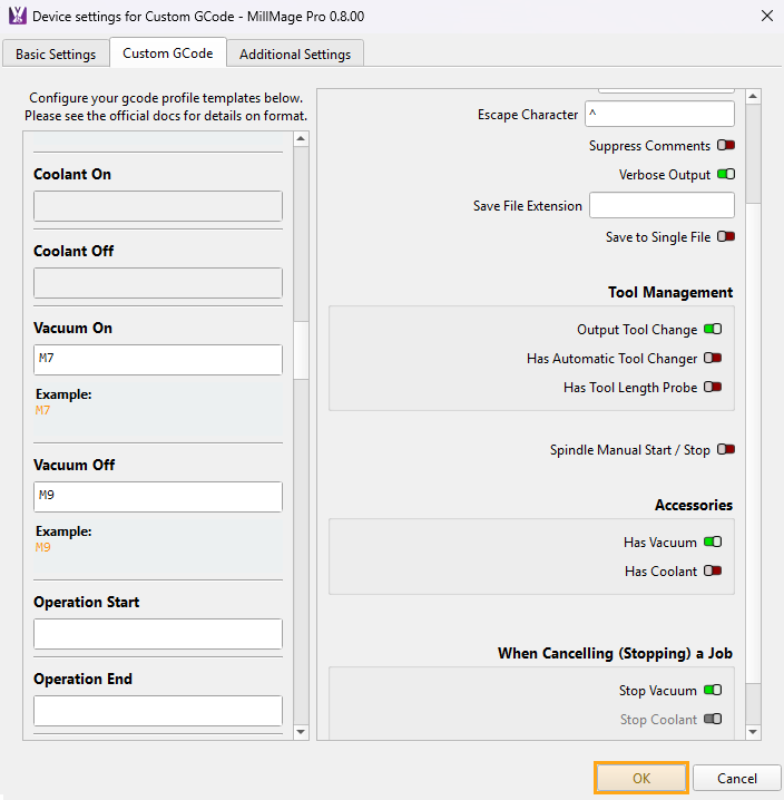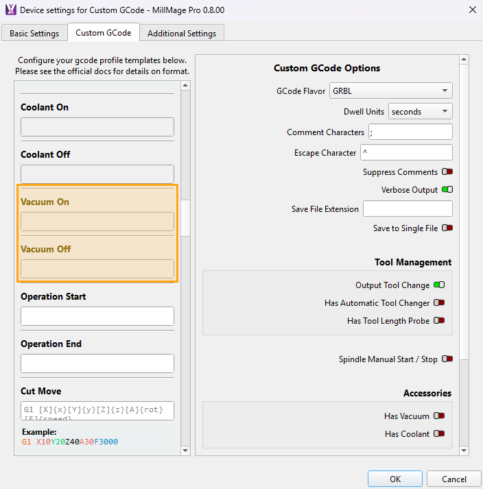 In this guide we will review what's needed to turn on and off vacuum accessories in MillMage using Custom GCode.
