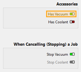 The Stop Vacuum toggle will activate automatically when Has Vacuum is enabled. This feature sends the M9 stop accessories command when the job is stopped by the user.