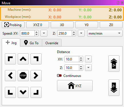 - Jog your CNC to the correct location and then press the Zero X/Y/Z buttons in the Move Window.
